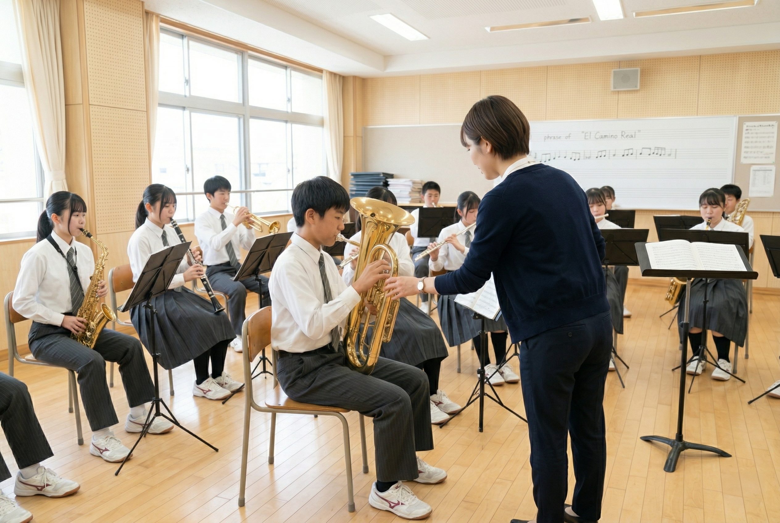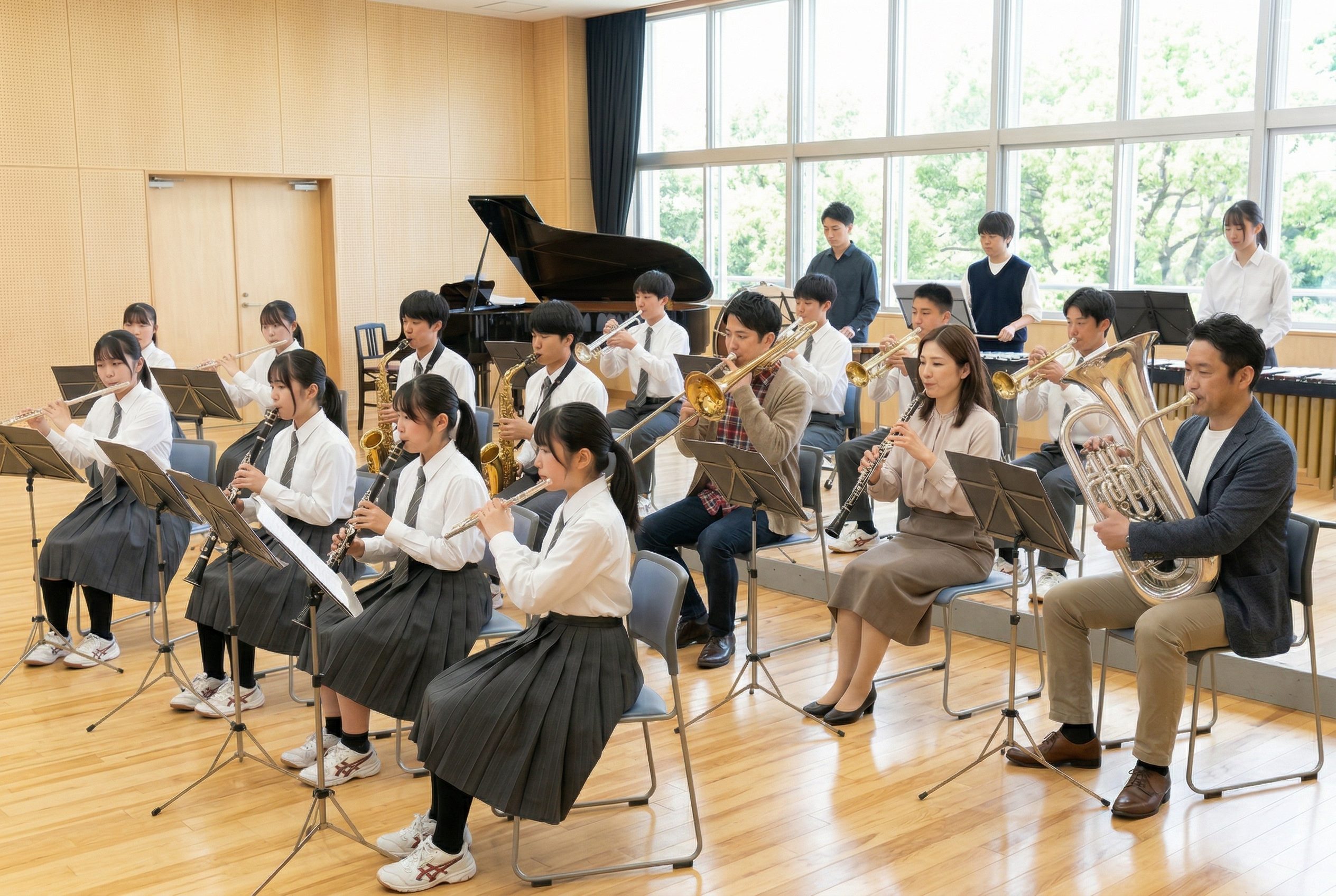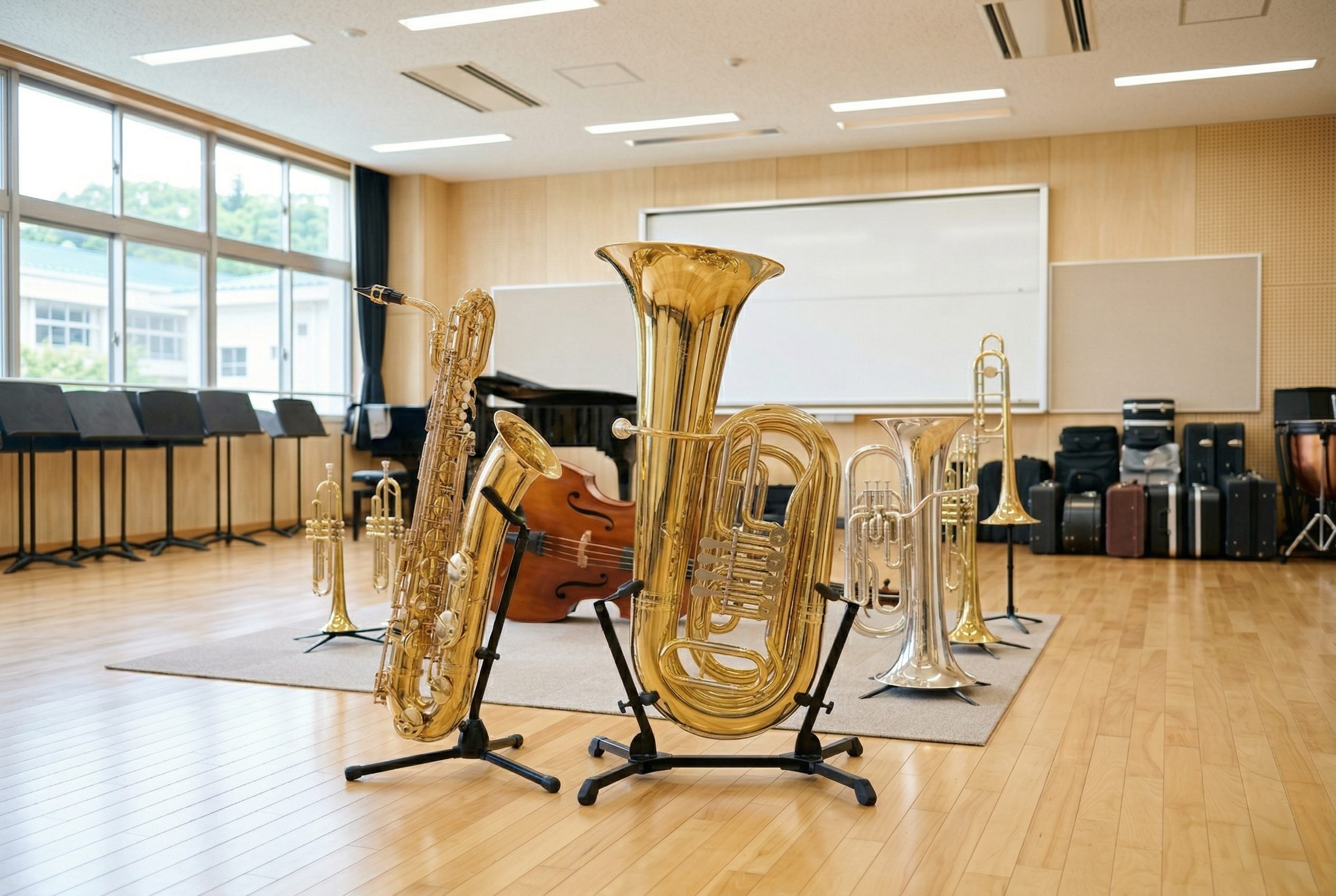 練習場所として中学校の音楽室を利用できるほか、大型楽器の貸出も行っています。学校の安心感と地域クラブの柔軟性を掛け合わせた、新しい活動スタイルです。 -